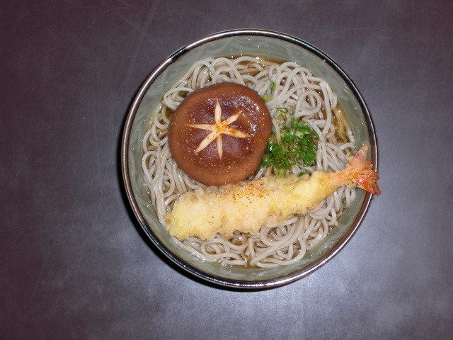 生そば:150g1玉、しいたけ含め煮:1枚、えび天:1本、小葱: 少々、めんつゆ:適量 お好みにより一味又は七味唐辛子