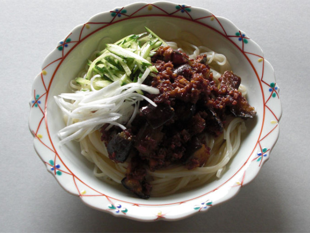 細めん:250g、茄子:2本、胡瓜小:1本、長ネギ:10cm、にんにくのみじん切り:1片分、合挽き肉:150g、生姜のみじん切り: 1かけ分、ザーサイ(味付)のみじん切り:30g、ごま油大さじ:1、合わせ調味料(みそ:大さじ21/2 砂糖:大さじ1 酒:大さじ1 みりん:大さじ1 醤油:小さじ1)